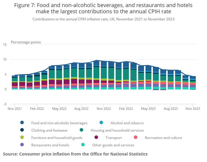 The CPIH includes extra housing components not included in the CPI. This can result in the largest contributions to the annual CPI and CPIH inflation rates coming from different divisions. However, in November 2023, the largest-contributing divisions were the same, namely food and non-alcoholic beverages (with a contribution of 1.08 percentage points to the CPI annual rate) and restaurants and hotels (1.02 percentage points).