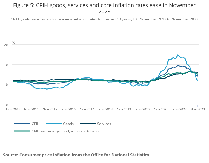 Figure 5: CPIH goods, services and core inflation rates ease in November 2023