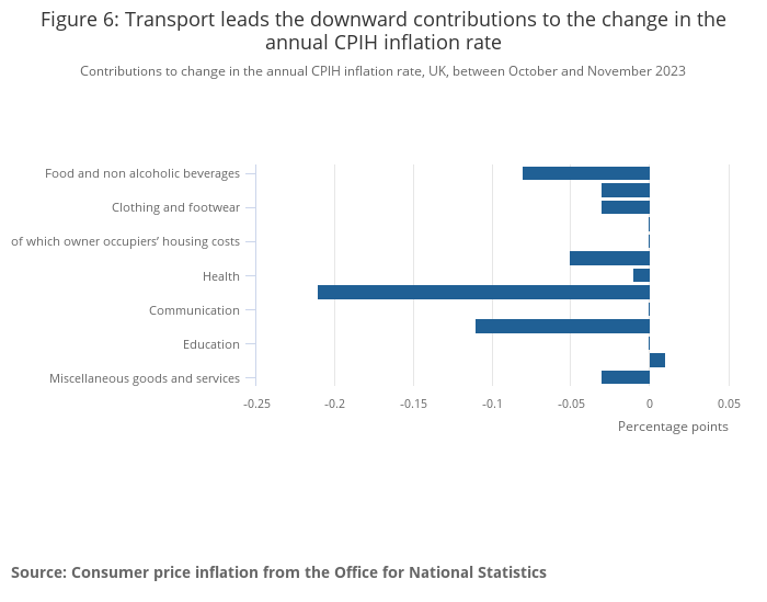 Contributions to change in the annual CPIH inflation rate, UK, between October and November 2023