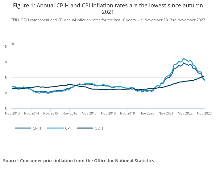 The Consumer Prices Index including owner occupiers' housing costs (CPIH) rose by 4.2% in the 12 months to November 2023, down from 4.7% in October.