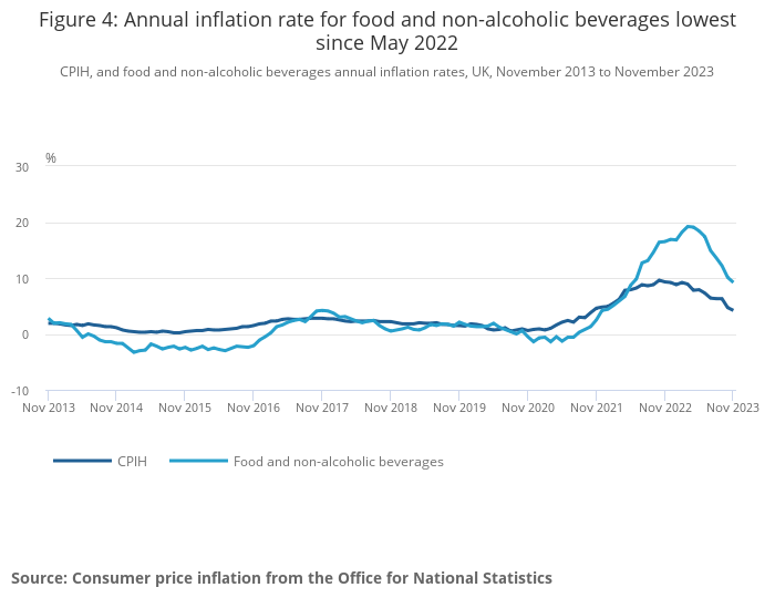 Although the annual inflation rate for food has been slowing, food prices are still high following relatively sharp rises over the latest two years. The overall price of food and non-alcoholic beverages rose by around 27% over the two years between November 2021 and November 2023. This compares with a rise of around 9% over the ten years between November 2011 and November 2021.