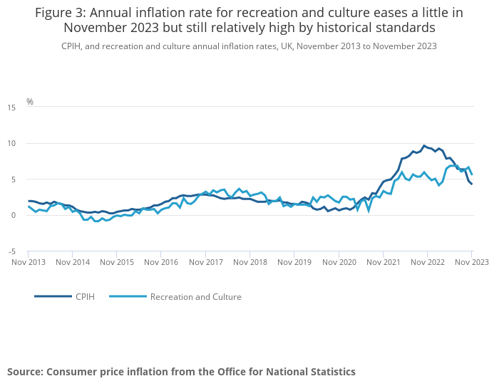 Figure 3: Annual inflation rate for recreation and culture eases a little in November 2023 but still relatively high by historical standards