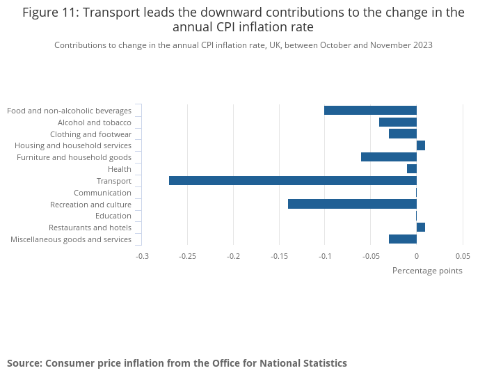 Contributions to change in the annual CPI inflation rate, UK, between October and November 2023