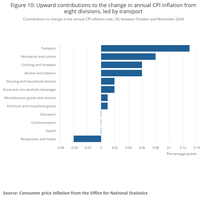 The increase in the rate into November 2024 reflected upward contributions from seven divisions partially offset by a small downward contribution from restaurants and hotels. The largest upward contributions came from transport, and housing and household services.