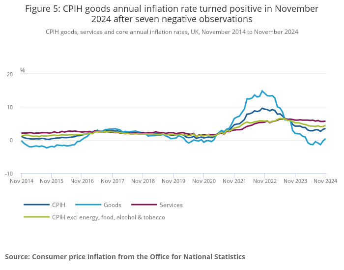 Figure 5: CPIH goods annual inflation rate turned positive in November 2024 after seven negative observations