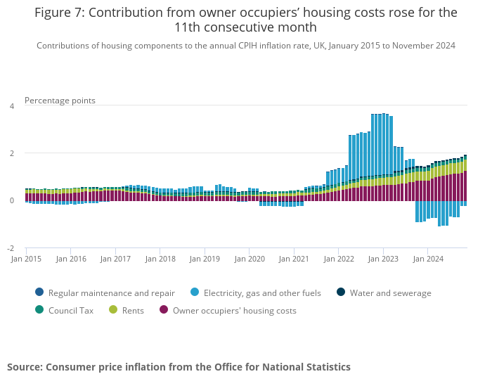 Contributions of housing components to the annual CPIH inflation rate, UK, January 2015 to November 2024