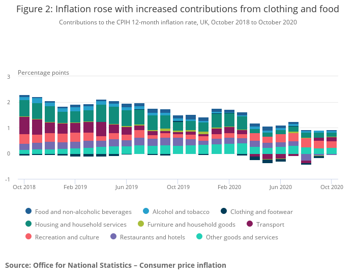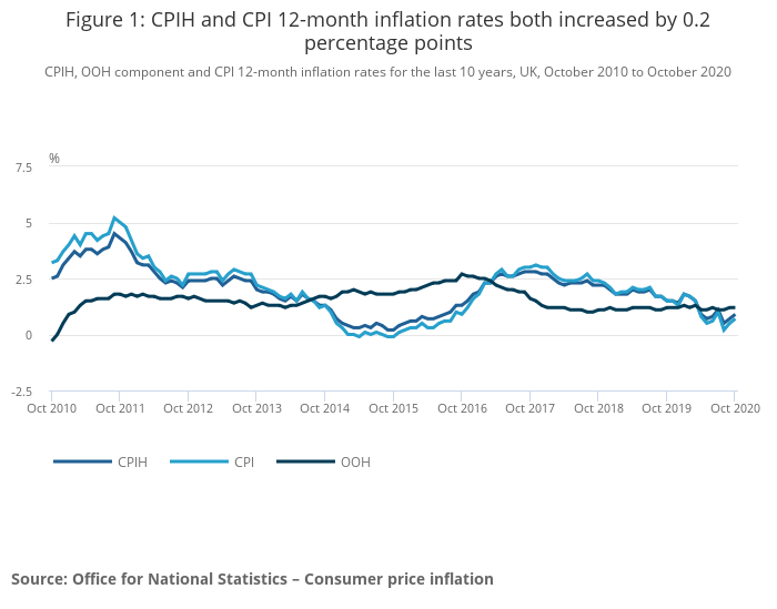 - The Consumer Prices Index including owner occupiers’ housing costs (CPIH) 12-month inflation rate was 0.9% in October 2020, up from 0.7% in September 2020.