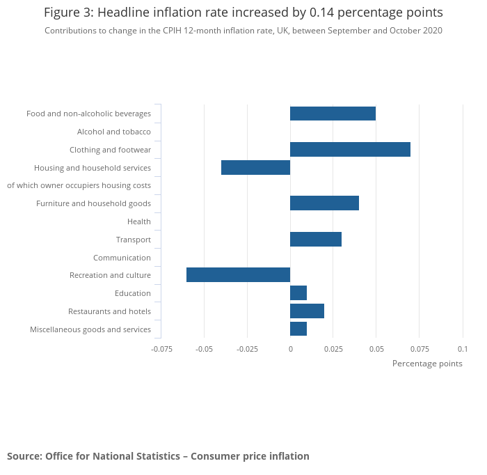 The increase in the CPIH 12-month inflation rate can mainly be attributed to changes in both the clothing and footwear, and the food and non-alcoholic beverages groups, between September and October 2020. In October, the restaurants and hotels group was the only CPIH group having a downward contribution to the CPIH 12-month inflation rate as the impact of the temporary reduction to Value Added Tax (VAT) continues to affect their contribution.