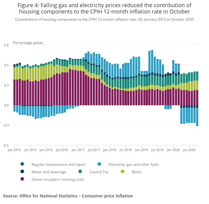 In April 2020, the contribution of housing components to the CPIH 12-month inflation rate fell to its lowest level (0.16 percentage points) since November 2010. The fall in contribution in April 2020 was the result of reduced contributions from electricity, gas, liquid fuels, water supply and sewerage collection. In October 2020, despite a small increase to the contribution over the last six months, the contribution of housing components fell back to 0.16 percentage points as a result of a reduced contribution from gas and electricity, where prices fell this year by more than a year ago.