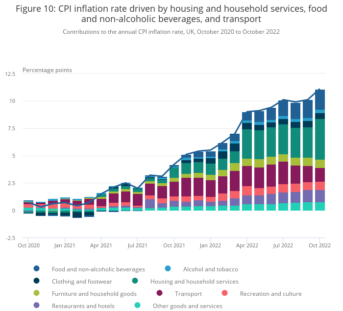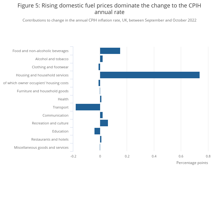 The largest upward contributions to the annual CPIH inflation rate in October 2022 came from housing and household services (principally from electricity, gas, and other fuels), food and non-alcoholic beverages, and transport (principally motor fuels).