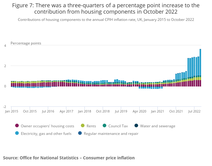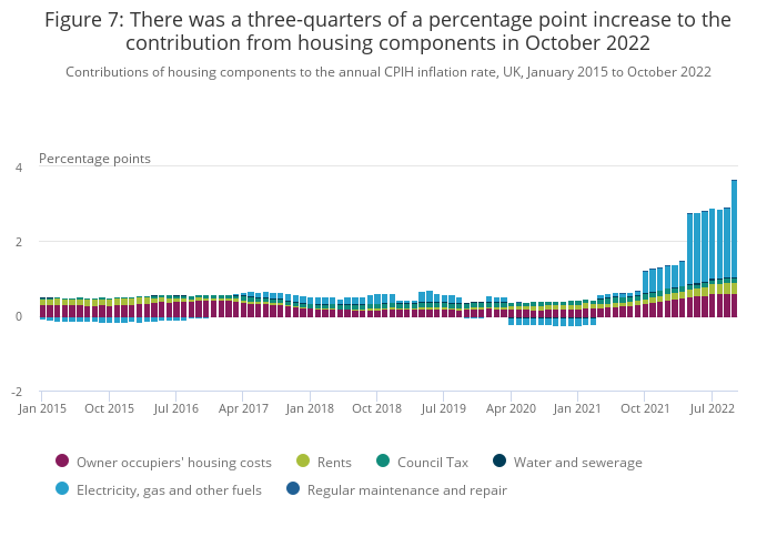 The Consumer Prices Index (CPI) differs from the CPIH in that it does not include owner occupiers' housing costs (OOH) and Council Tax. Figure 7 shows the contribution of these components to the annual CPIH inflation rate in the context of wider housing-related costs. In October 2022, the contribution of housing and household services in total to the annual CPIH inflation rate was 3.68 percentage points, up from 2.94 percentage points in September 2022. The October figure was the highest in the National Statistic series, which began in January 2006.