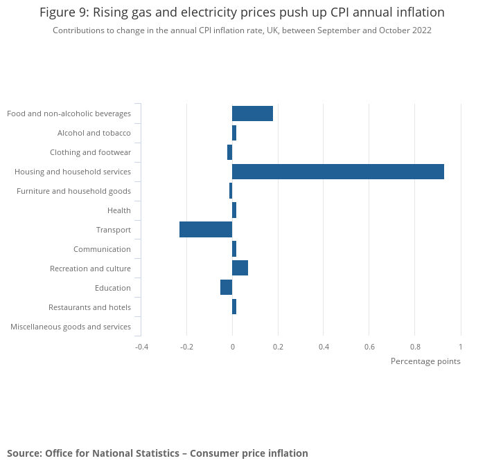 Contributions to change in the annual CPI inflation rate, UK, between September and October 2022
