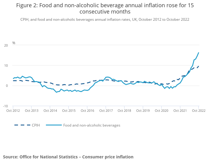 CPIH, and food and non-alcoholic beverages annual inflation rates, UK, October 2012 to October 2022