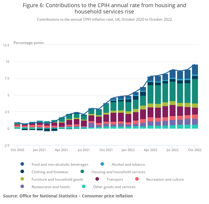 The largest contribution to the annual rate in October 2022 for both CPIH and CPI came from housing and household services. Other large contributions came from food and non-alcoholic beverages, and from transport.