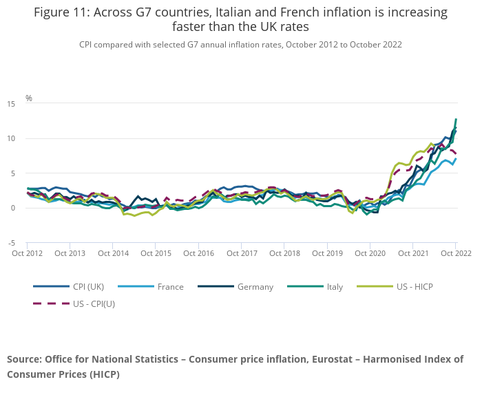 CPI compared with selected G7 annual inflation rates, October 2012 to October 2022