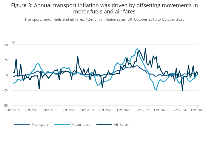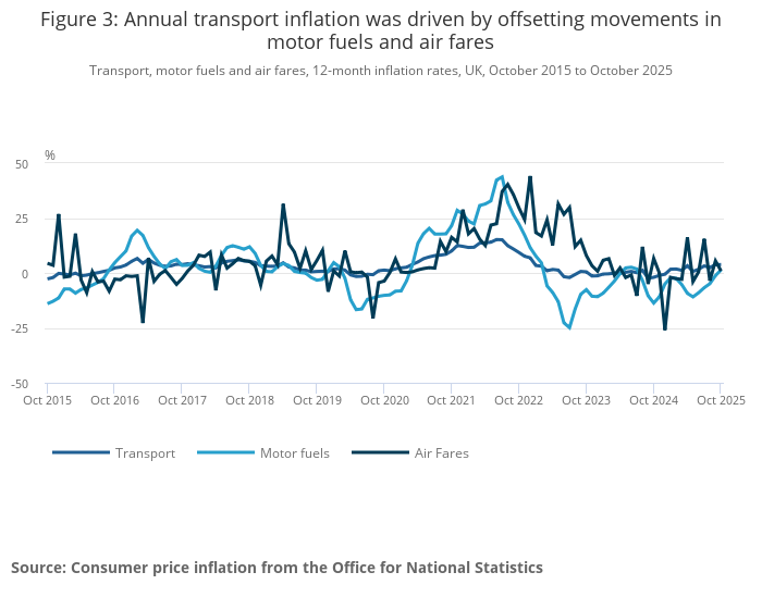 Transport, motor fuels and air fares, 12-month inflation rates, UK, October 2015 to October 2025