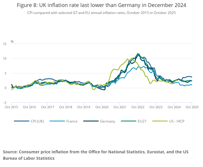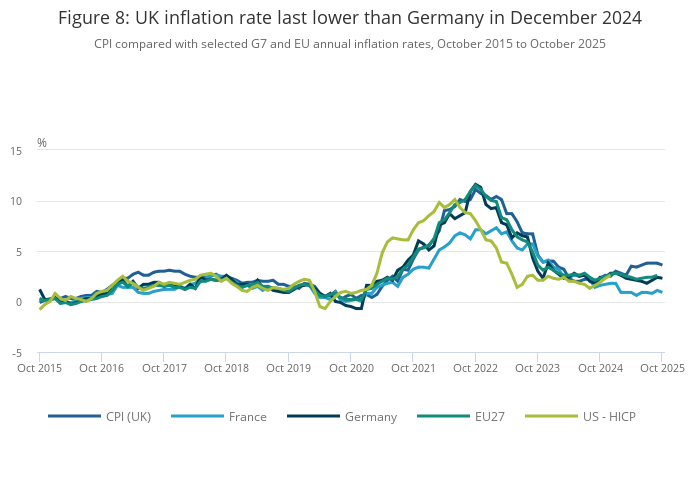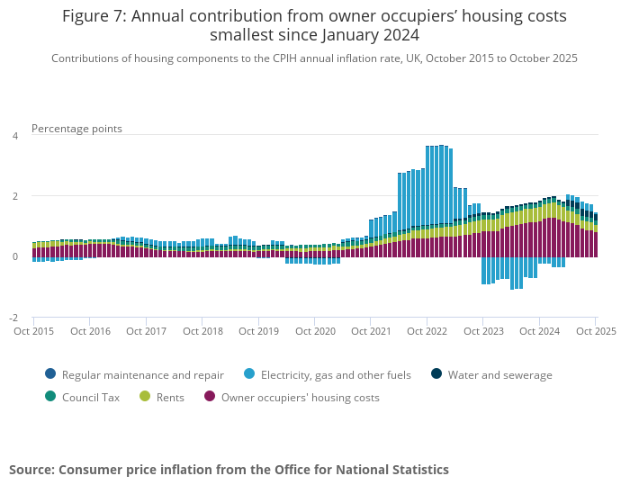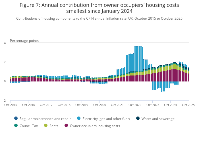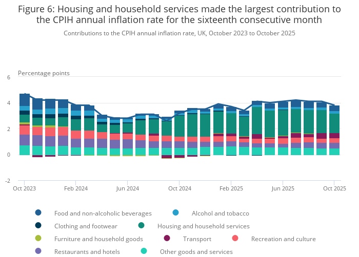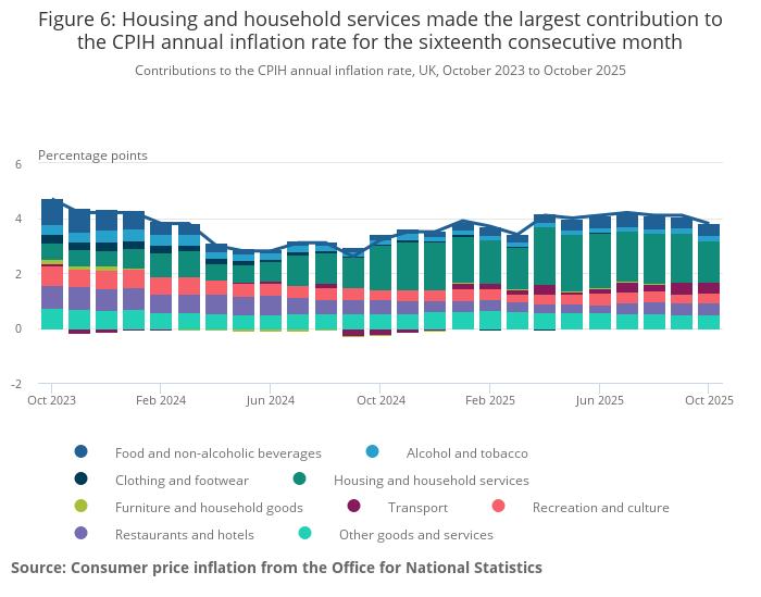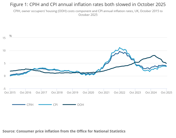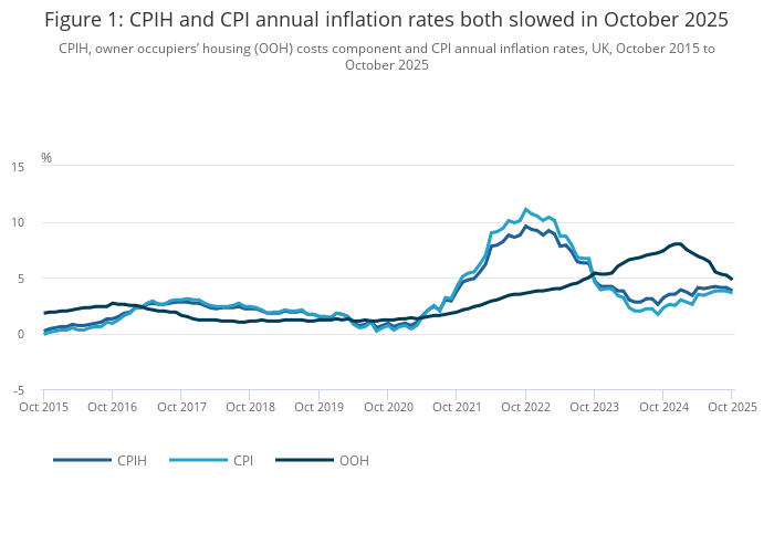 - The Consumer Prices Index including owner occupiers' housing costs (CPIH) rose by 3.8% in the 12 months to October 2025, down from 4.1% in September.