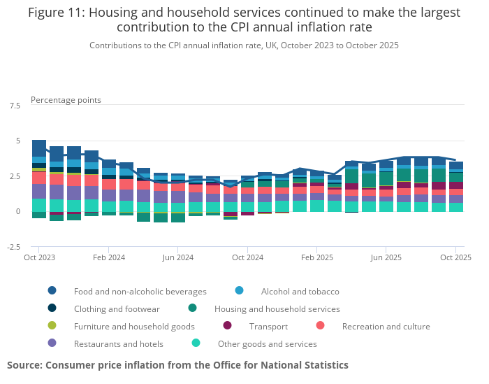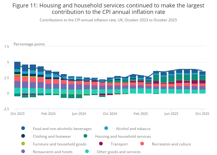 Contributions to the CPI annual inflation rate, UK, October 2023 to October 2025