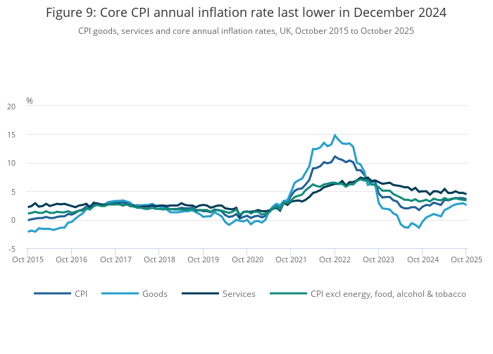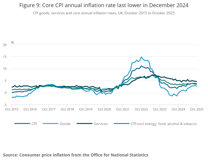Core CPI (CPI excluding energy, food, alcohol and tobacco) rose by 3.4% in the 12 months to October 2025, down from 3.5% in the 12 months to September; the CPI goods annual rate fell from 2.9% to 2.6%, while the CPI services annual rate fell from 4.7% to 4.5%.