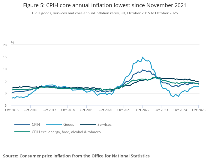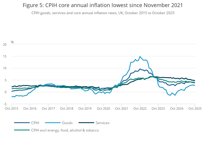 Core CPIH (CPIH excluding energy, food, alcohol and tobacco) rose by 3.7% in the 12 months to October 2025, down from 3.9% in the 12 months to September; the CPIH goods annual rate fell from 2.9% to 2.6%, while the CPIH services annual rate fell from 4.9% to 4.6%.
