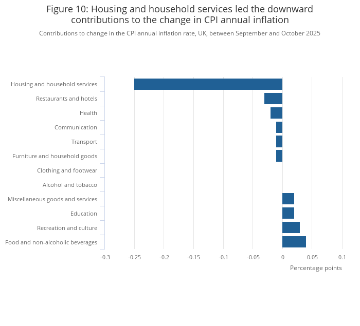 Contributions to change in the CPI annual inflation rate, UK, between September and October 2025