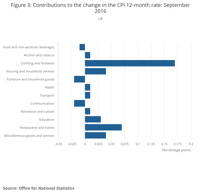Clothing and footwear: the upward effect came primarily from garments (in particular women’s outerwear), for which prices rose by 6.0% between August and September 2016, compared with a rise of 3.3% a year ago. Whilst this rise is relatively large historically, there are factors to take into account when considering whether this is a result of sterling depreciation following the EU referendum result. First, a rise in clothing prices in September is in line with normal trends and the comparatively large increase this year follows a sustained fall in prices between March and July, with a relatively small increase into August. Second, whilst the depreciation in sterling is likely to increase the cost of importing goods and outsourcing production, there are reports of businesses having measures in place to protect against exchange rate changes in the short-term.