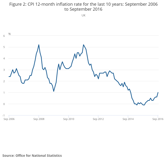 The CPI 12-month rate (the amount prices change over a year) between September 2015 and September 2016 stood at 1.0%. This means that a basket of goods and services that cost £100.00 in September 2015 would have cost £101.00 in September 2016.