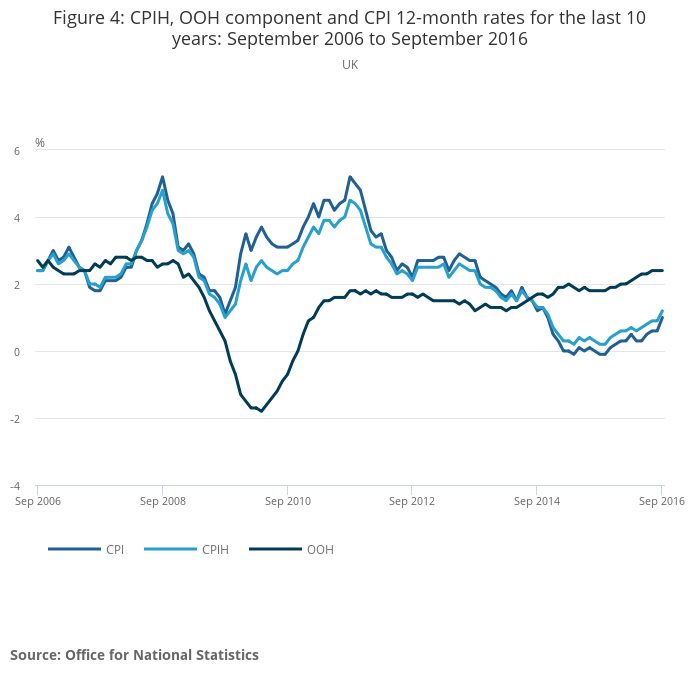 Figure 4: CPIH, OOH component and CPI 12-month rates for the last 10 years: September 2006 to September 2016