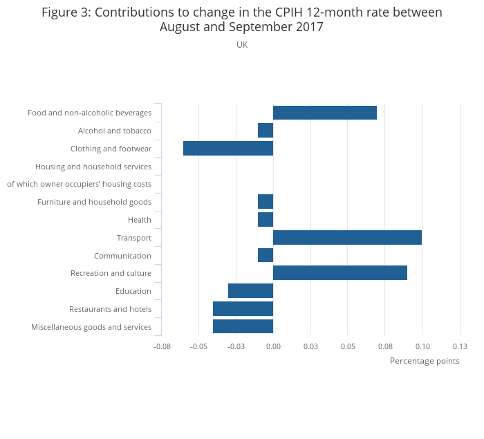 Figure 3 shows how each of the main groups of goods and services contributed to the change in the Consumer Prices Index including owner occupiers’ housing costs (CPIH) 12-month rate between August and September 2017. The corresponding figures for the Consumer Prices Index (CPI) can be found in column F of Table 26 in the CPI dataset.