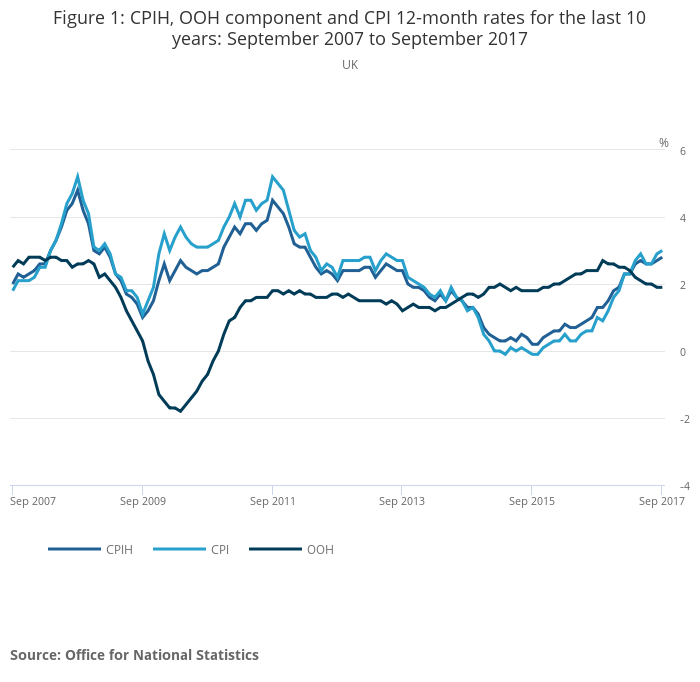 Download this chart Figure 1: CPIH, OOH component and CPI 12-month rates for the last 10 years: September 2007 to September 2017