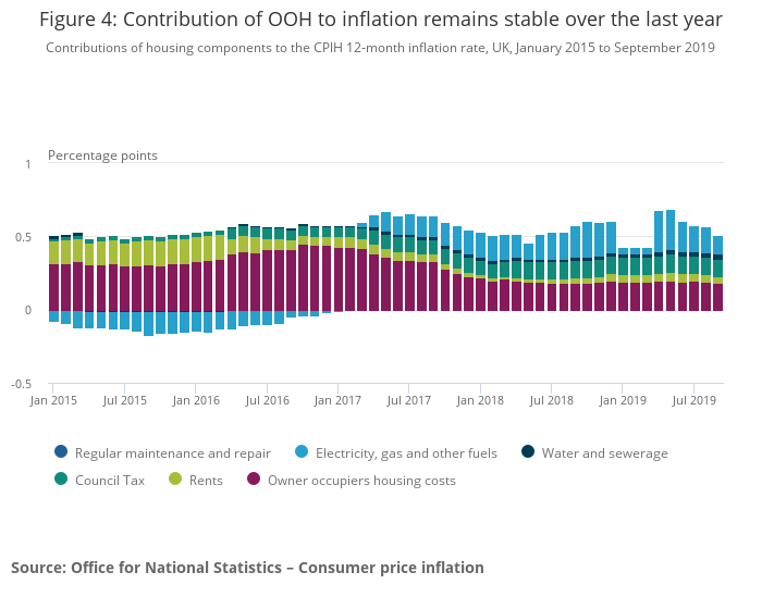 Figure 4 shows the contribution of OOH and Council Tax to the CPIH inflation rate in the context of wider housing-related costs. The contribution from OOH had been on a downward trend from a high in October 2016. However, it has stabilised over the last year and was the largest contribution to the CPIH 12-month inflation rate from all the housing and household services categories for the majority of months of 2019, including September.
