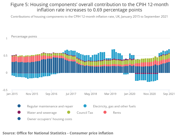 Image .csv .xlsFigure 5 shows the contribution of owner occupiers’ housing costs (OOH) and council tax to the Consumer Prices Index including owner occupiers’ housing costs (CPIH) 12-month inflation rate in the context of wider housing-related costs. In September 2021, the contribution of housing components to the CPIH 12-month inflation rate was 0.69 percentage points, an increase of 0.04 percentage points from August 2021.