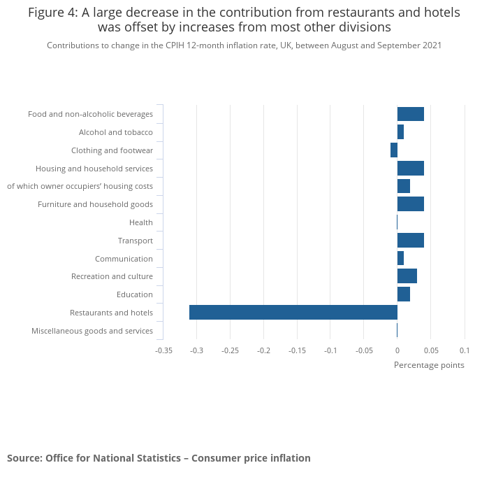 The 12-month inflation rate for restaurants and hotels was negative in September 2020, at -0.7%. At the time, some outlets continued to offer discounted meals to diners past the end of the EOHO scheme, and these were reflected in the September 2020 CPIH figures, provided that the terms of the offer exactly matched the terms of the EOHO scheme. The lower-than-usual level of the index at this time is part of the reason for the 0.34 percentage point contribution from this division in September 2021.