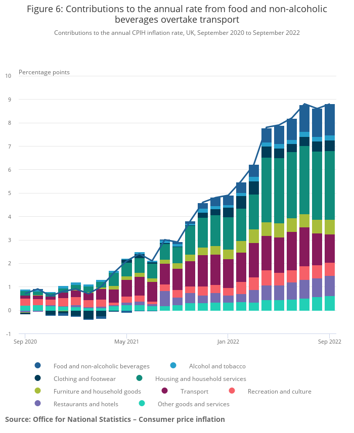 The largest contribution to the annual rate in September 2022 for both CPIH and CPI is from housing and household services. The second largest contribution came from food and non-alcoholic beverages, which has overtaken that from transport.