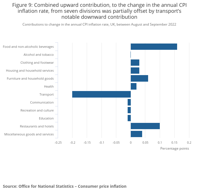 Contributions to change in the annual CPI inflation rate, UK, between August and September 2022