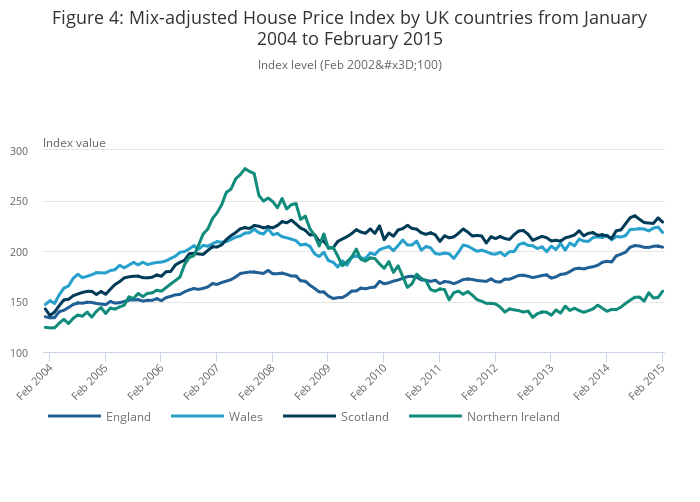 Figure 4: Mix-adjusted House Price Index by UK countries from January 2004 to February 2015