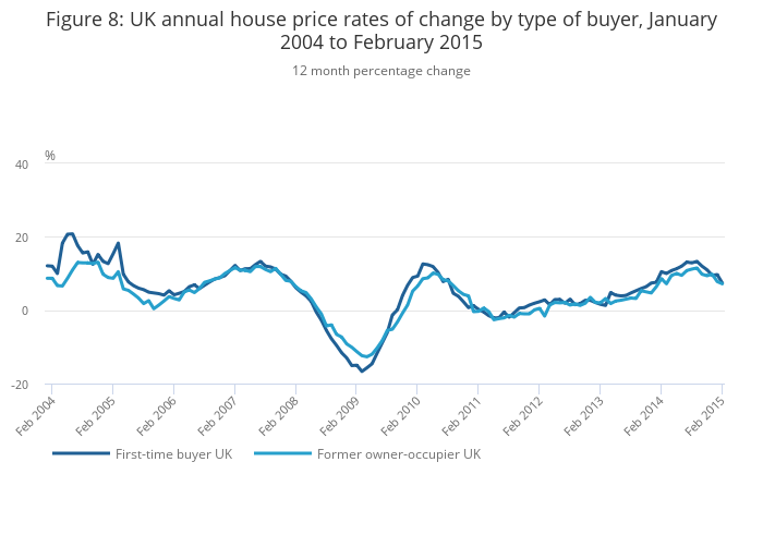 Figure 8: UK annual house price rates of change by type of buyer, January 2004 to February 2015