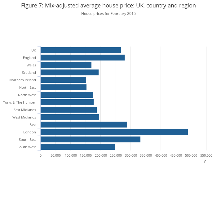 Average mix-adjusted house prices in February 2015 stood at £280,000 in England, £170,000 in Wales, £152,000 in Northern Ireland and £194,000 in Scotland (Figure 7).