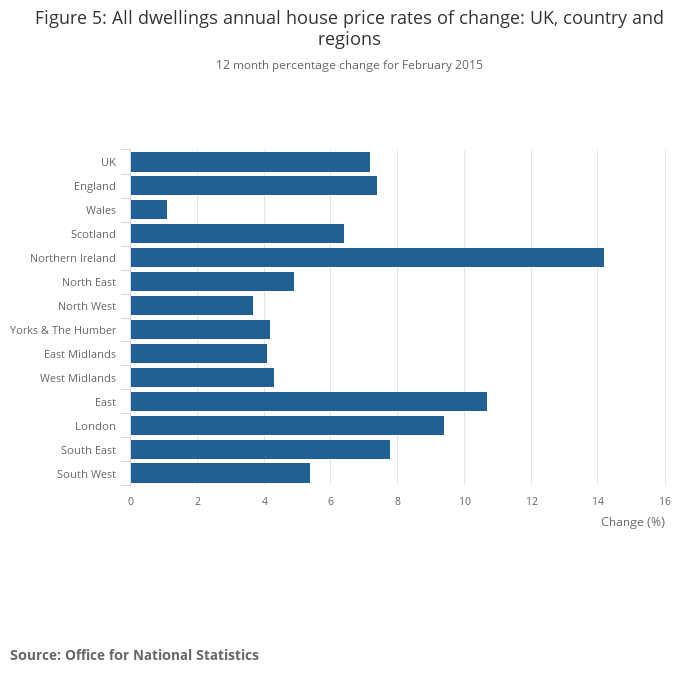 During the year to February 2015, average house prices increased 7.4% in England, 1.1% in Wales, 6.4% in Scotland and 14.2% in Northern Ireland (Figure 3). This is the highest annual increase in Northern Ireland since November 2007.