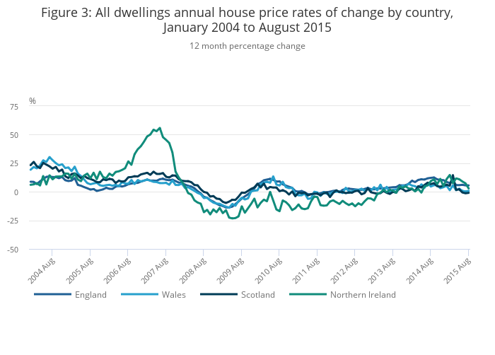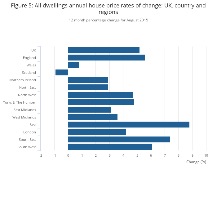 During the year to August 2015, average house prices increased by 5.6% in England (unchanged from 5.6% in the year to July 2015), 0.8% in Wales (up from 0.3%) and 2.9% in Northern Ireland (down from 7.4%). House prices fell 0.9% in Scotland over the last twelve months (compared with an annual fall of 1.3% last month).