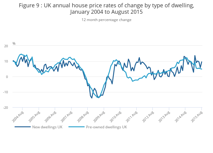 Figure 9 : UK annual house price rates of change by type of dwelling, January 2004 to August 2015