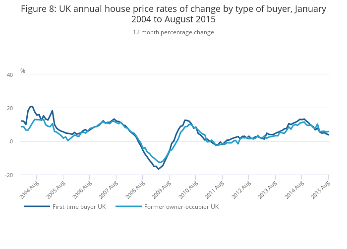 Download this chart Figure 8: UK annual house price rates of change by type of buyer, January 2004 to August 2015