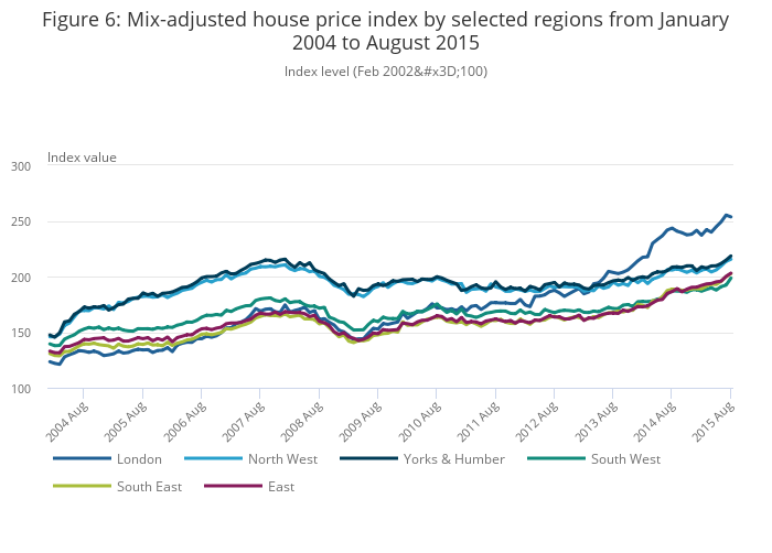 Download this chart Figure 6: Mix-adjusted house price index by selected regions from January 2004 to August 2015