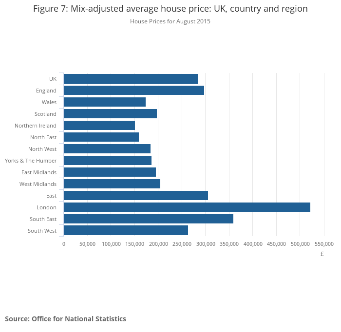 In August 2015, London continued to be the English region with the highest average house price at £522,000 and the North East had the lowest average house price at £160,000. London, the South East and the East all had prices higher than the UK average price of £284,000.