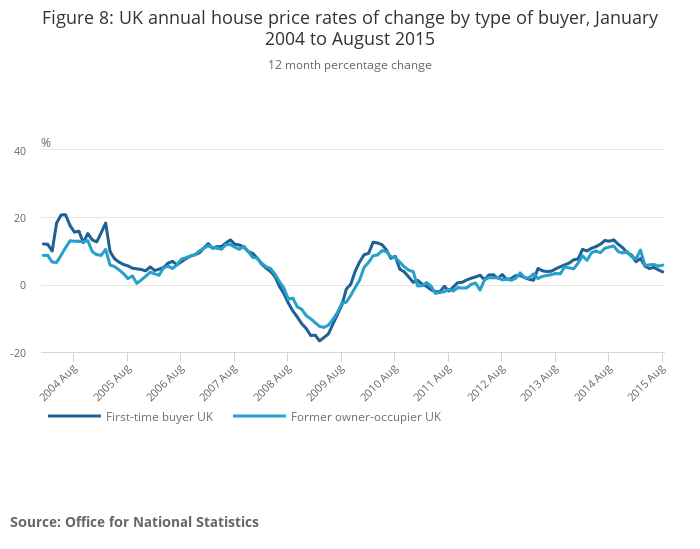Figure 8: UK annual house price rates of change by type of buyer, January 2004 to August 2015