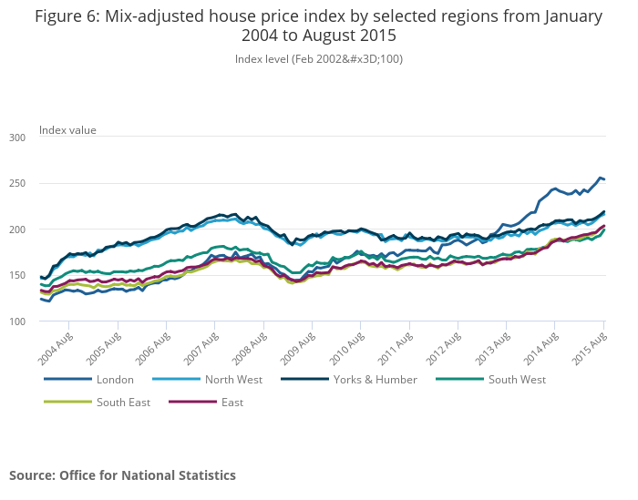 the price index for London is now 0.6% below the record level of 255.2 in July 2015 with an index of 253.6 in August 2015 - however, the London index is 45.3% higher than the pre-economic downturn peak in January 2008 (174.5)