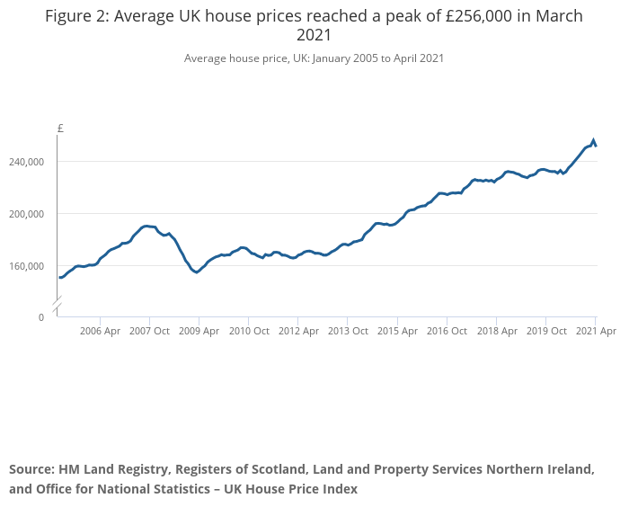 Figure 2: Average UK house prices reached a peak of £256,000 in March 2021
