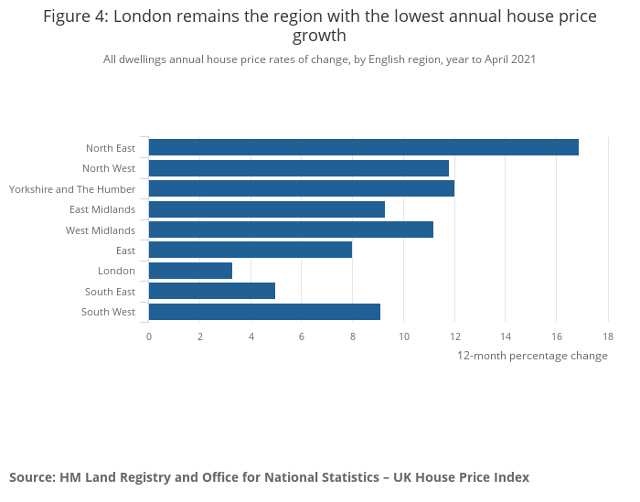The lowest annual growth was in London, where average prices increased by 3.3% over the year to April 2021, down from 4.0% in March 2021.