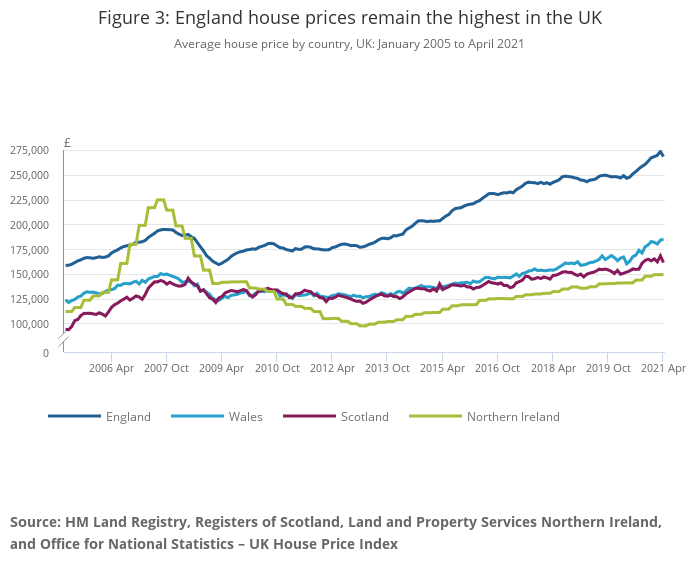 Average house prices increased over the year in England to £268,000 (8.9%), in Wales to £185,000 (15.6%), in Scotland to £161,000 (6.3%) and in Northern Ireland to £149,000 (6.0%).