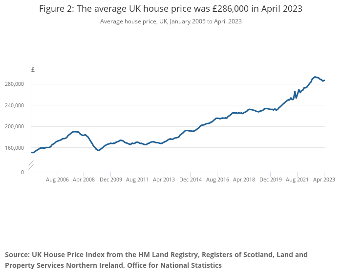The average UK house price was £286,000 in April 2023, which is £9,000 higher than 12 months ago, but £7,000 below the recent peak in September 2022.